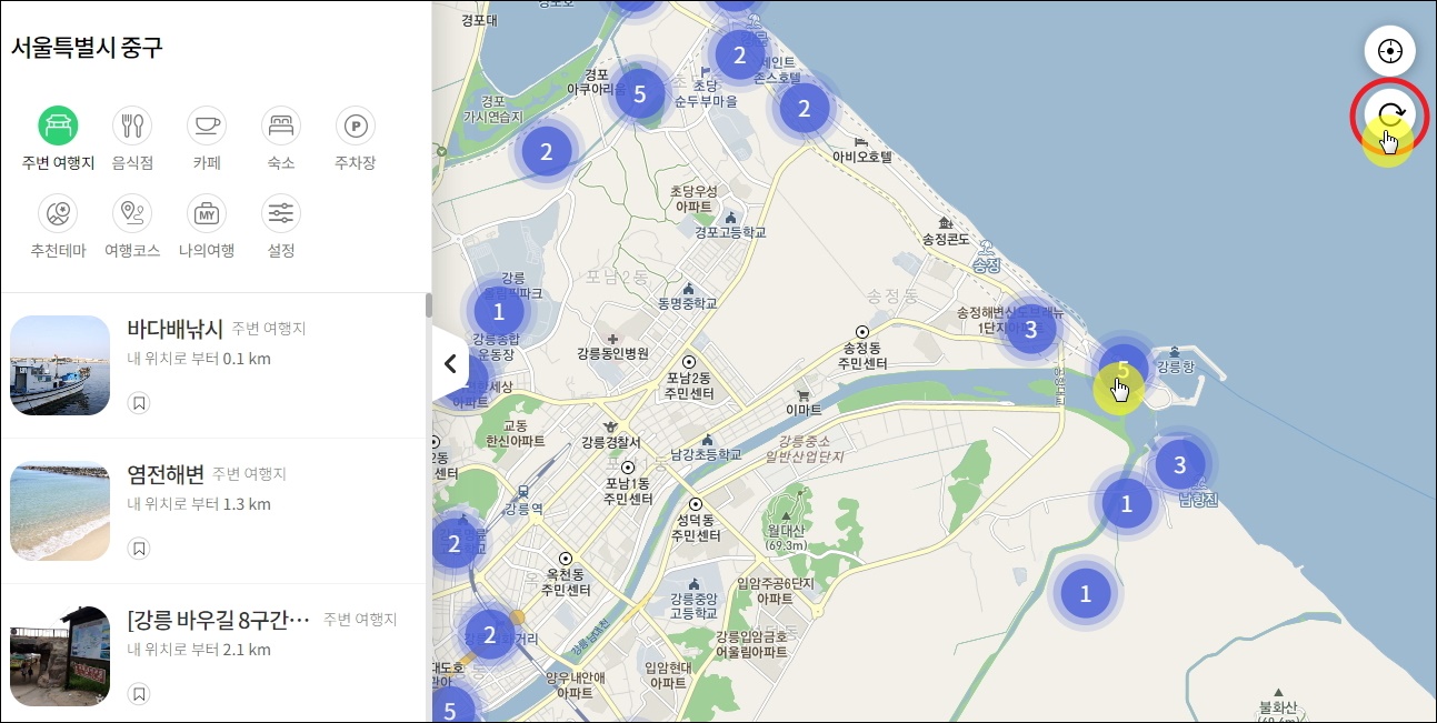 ▼지도 화면에서 여행을 가고 싶거나 관심이 있는 지역을 띄워 보세요. 그 다음 우측 상단에 있는 재설정 모양의 버튼을 클릭합니다. 그럼 해당 지역에 있는 주변 관광지의 위치와 갯수가 표시됩니다. 해당 표시를 클릭하면 지도가 확대되면서 상세 위치를 파악할 수 있게 됩니다.