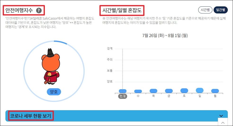 ▼대한민국은 전 세계에서 관광하기에 안전하기로 손꼽히는 나라입니다. 여기에 더하여 안전여행지수를 참고하면 각 지역을 더욱 더 안전하게 여행할 수 있습니다. 시간별 및 일별 혼잡도를 참고하여 사람이 분비는 때를 피할 수도 있어요.