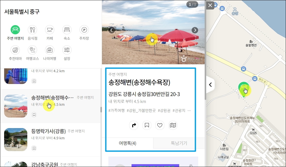 ▼확대해서 들어가보니 유명 관광지 중 하나인 송정해변을 찾았습니다. 대한민국에서 많이 찾는 해수욕장 중 하나인데요. 관광지 표시를 클릭하면 화면 중앙에 관련 사진, 상세 주소, 나와의 거리, 여행톡이 나타납니다. 여기서 사진 부분을 마우스로 클릭해 보세요.