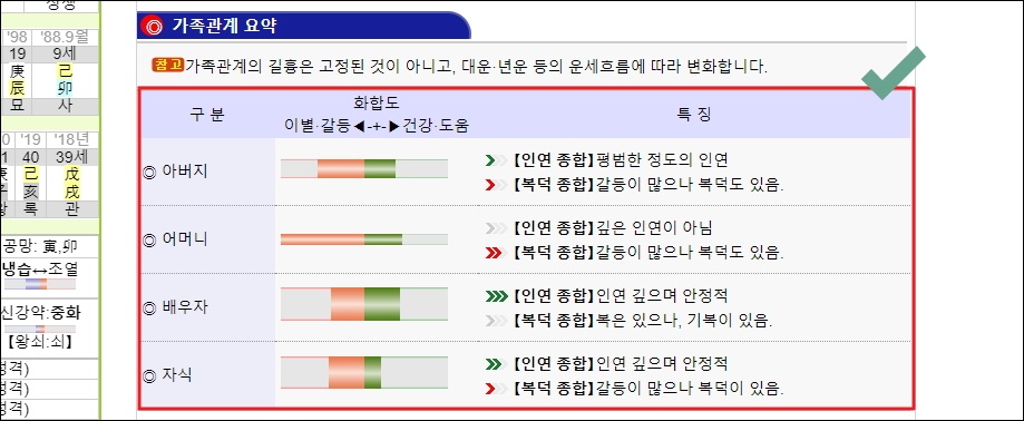 ▼가족과의 관계에 대한 운도 만세력을 통해 알아볼 수 있습니다. 아버지, 어머니, 배우자, 자식과의 화합도와 관계에 대한 특징을 확인할 수 있는데요. 프로그램을 통해 인연의 정도, 안정적인지 여부, 복이 있는지를 확인할 수 있습니다.