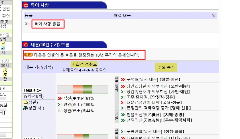 ▼특이 사항은 만세력 프로그램을 이용하는 사람에 따라 나타날 때도 있고, 그렇지 않을 때도 있습니다. 만세력에서 중요한 대운 흐름을 살펴보겠습니다. 10년마다 바뀌는 운세로 인생의 큰 흐름을 결정짓는데요. 각 기간 동안 사회적 성취도가 어떠한지 그리고 특징을 통해 상세하게 살펴볼 수 있습니다.