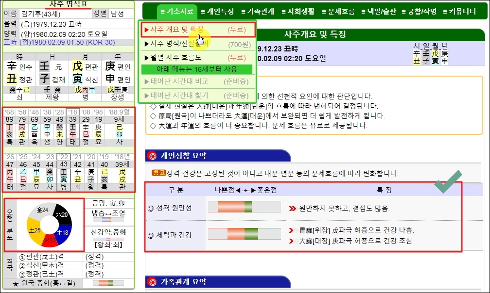 ▼좌측에 보면 우리가 입력한 사주 정보를 바탕으로 만들어진 사주 명식표가 나타납니다. 그 아래에는 만세력 결과가 나타나는데요. 대운, 연운, 오행 분포, 격국을 확인할 수 있습니다. 만세력에 대한 풀이를 보고 싶다면 프로그램 메뉴에서 [기초자료]와 [사주 개요 및 특징]을 클릭합니다. 무료로 이용할 수 있는 서비스입니다.