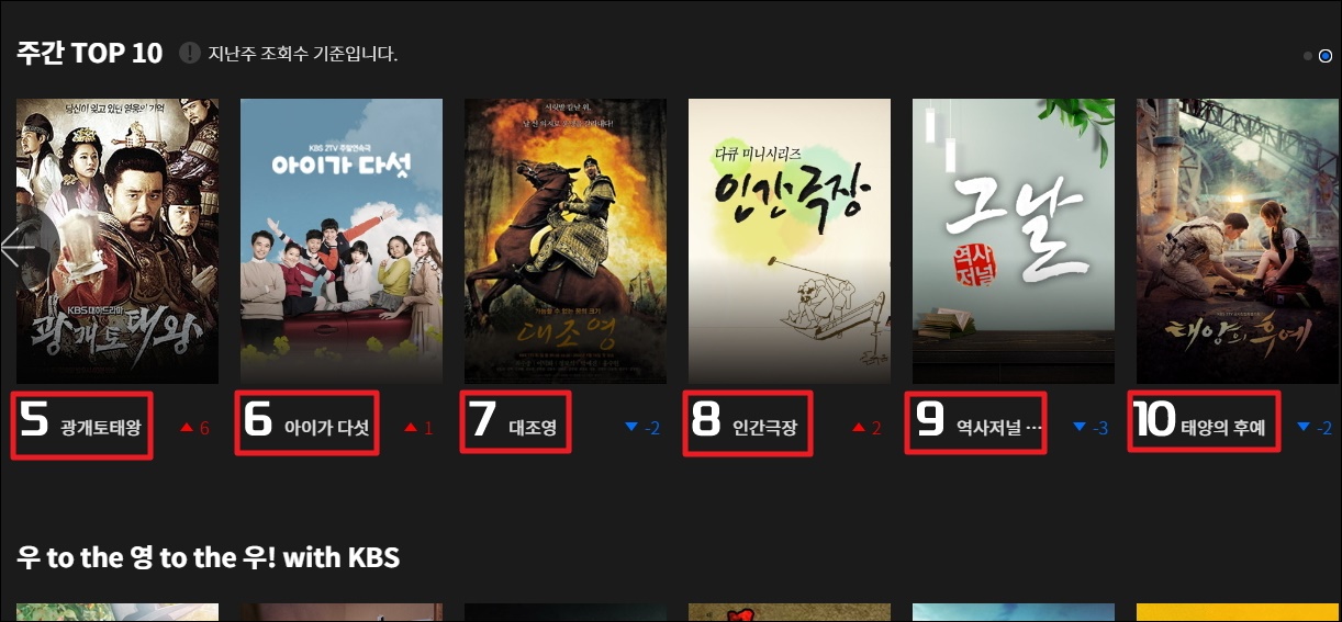 ▼앞서 살펴본 주간 TOP 10 VOD가 나타났습니다. 대조영, 인간극장, 역사저널 그날, 태양의 후예 등 재미있는 티비 프로그램이 많이 보입니다. 태양의 후예는 엄청나게 많은 인기를 누렸던 작품이죠. 여기서 다시보기 원하는 작품을 클릭해 주세요.