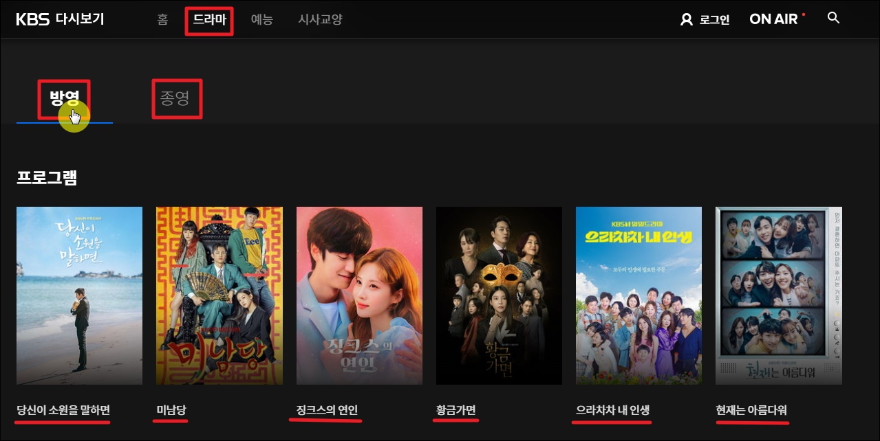 ▼사이트 화면에서 맨 위를 보면 kbs 다시보기 관련 메뉴가 여러 개 나타납니다. 홈, 드라마, 예능, 시사교양 이렇게 4가지가 있는데요. 여기에서 [드라마] 메뉴를 선택해 보세요. 그럼 방영과 종영 이렇게 2가지로 구분된 kbs 드라마 목록을 살펴볼 수 있습니다. 현재 방영중인 드라마 작품으로 당신이 소원을 말하면, 미남당, 징크스의 연인, 황금가면, 현재는 아름다워, 으라차차 내 인생이 등이 있습니다. 이렇게 현재 방영이 되고 있는 드라마에 대해서도 다시 볼 수 있어요.