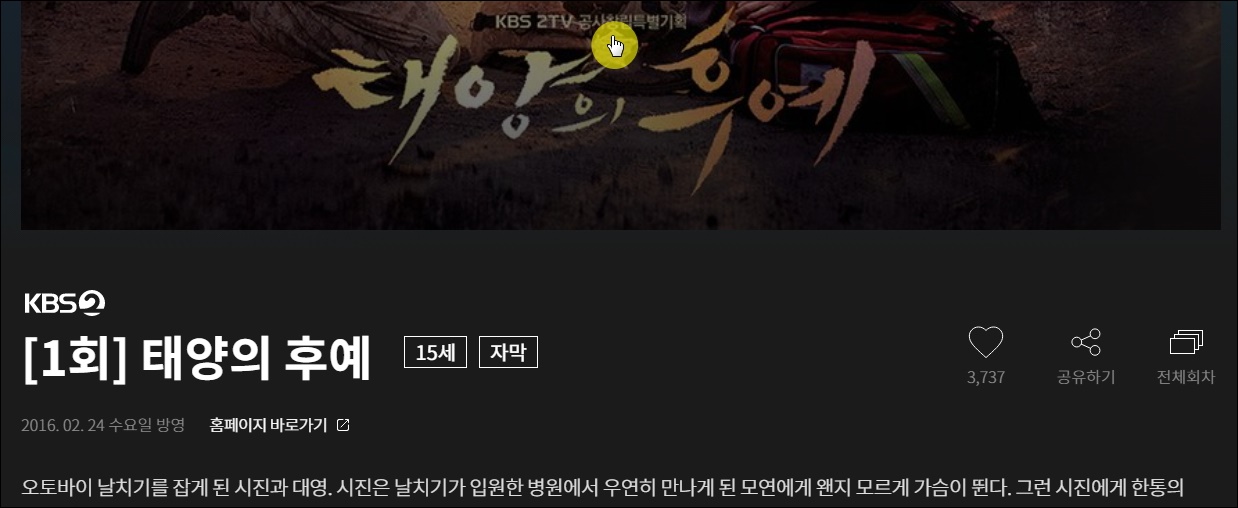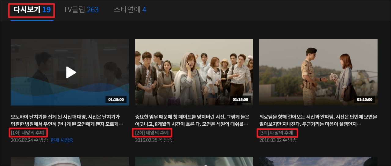 ▼저는 태양의 후예를 선택했습니다. 바로 작품을 감상할 수 있는 VOD 다시보기 플레이어가 나타납니다. 재생 버튼을 클릭하면 바로 나와요.