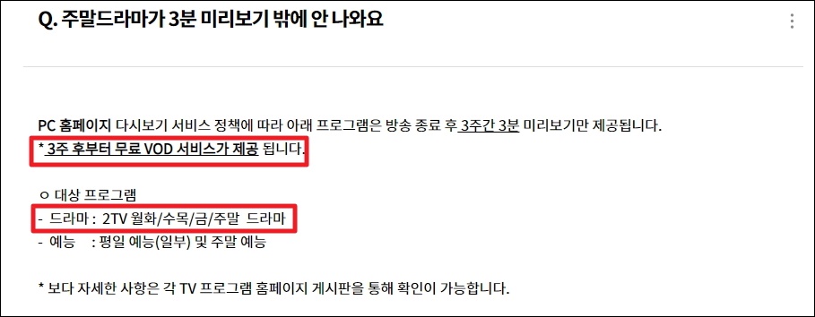 ▼참고로 kbs 홈페이지에서 드라마를 다시보기 할 때 알고 있어야 하는 사항이 있습니다. 몇 몇 작품의 경우에는 3주 후부터 무료 VOD 서비스가 제공되고 있는데요.
