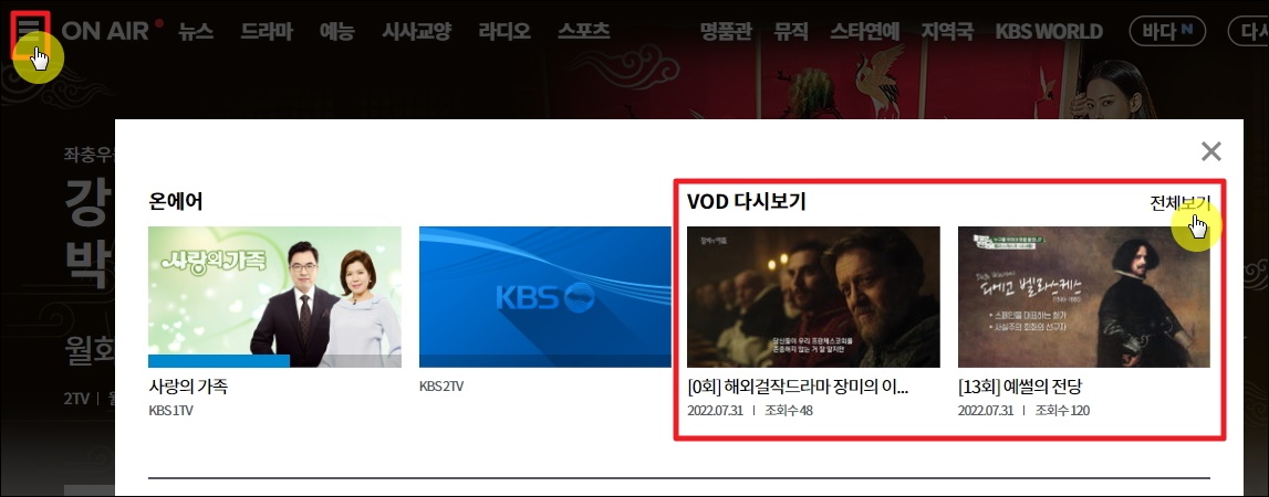 ▼kbs 공식 사이트에 접속했습니다. 뉴스, 드라마, 예능, 시사교양, 라디오, 스포츠 등 여러 가지 메뉴가 보이는데요. 여기에서 가장 좌측에 있는 "三" 모양으로 된 버튼을 클릭해 주세요. 그럼 온에어와 VOD 다시보기 목록이 나타납니다. 여기에서 [전체보기] 버튼을 클릭해 주세요.