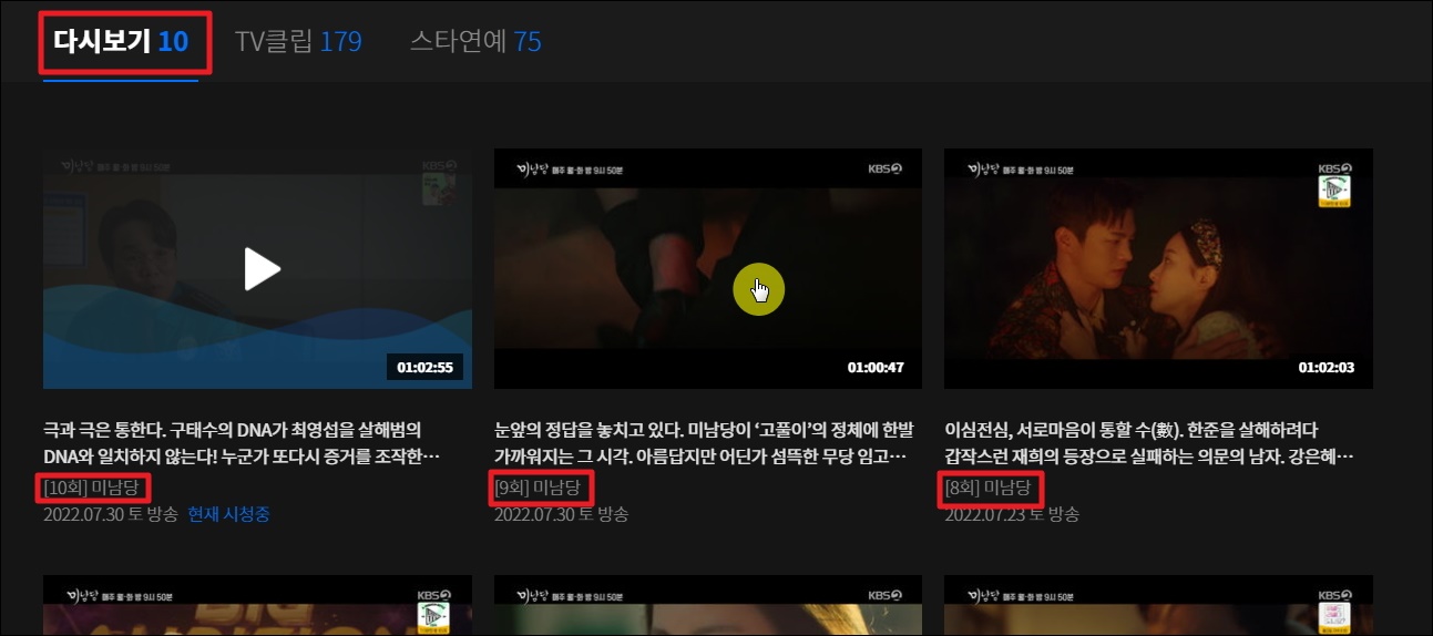 ▼사이트 화면에서 맨 위를 보면 kbs 다시보기 관련 메뉴가 여러 개 나타납니다. 홈, 드라마, 예능, 시사교양 이렇게 4가지가 있는데요. 여기에서 [드라마] 메뉴를 선택해 보세요. 그럼 방영과 종영 이렇게 2가지로 구분된 kbs 드라마 목록을 살펴볼 수 있습니다. 현재 방영중인 드라마 작품으로 당신이 소원을 말하면, 미남당, 징크스의 연인, 황금가면, 현재는 아름다워, 으라차차 내 인생이 등이 있습니다. 이렇게 현재 방영이 되고 있는 드라마에 대해서도 다시 볼 수 있어요.