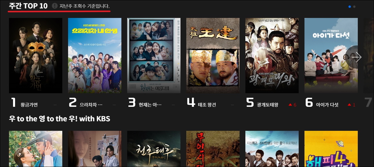 ▼최근 kbs 홈페이지를 이용하여 많이 찾는 드라마 목록을 살펴보았습니다. 황금가면, 으라차차 내 인생, 현재는 아름다워, 태조 왕건, 관개토 대왕, 아이가 다섯이 1위에서 6위를 차지하고 있는데요. 대부분 마지막회까지 나온 인기 작품들입니다. 처음부터 끝까지 몰아서 보기에 좋죠.