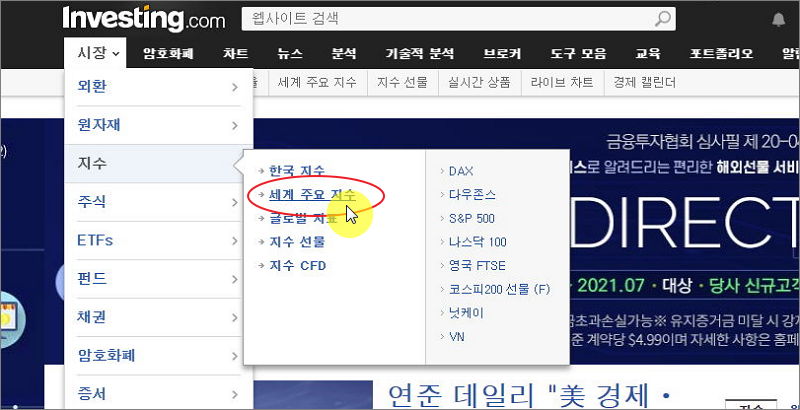 ▲ 메뉴에서 "세계 주요 지수" 클릭