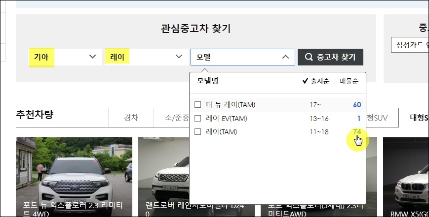 ▼관심 있는 중고차 모델을 찾는 데에 사용하는 도구가 나타났습니다. 제조사, 시리즈명, 모델명을 차례대로 선택합니다. 모델명을 선택할 때에는 정확한 시세조회를 위해 매물이 많은 것 위주로 선택하는 것이 좋습니다.