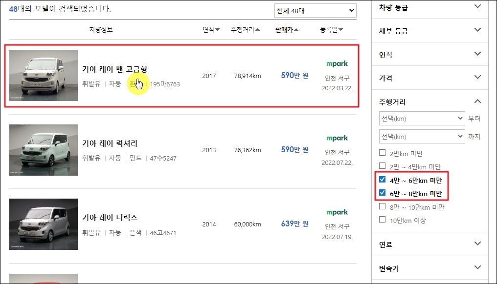 ▼같은 시리즈 모델이라고 하여도 차량 상태나 스펙이 제각각입니다. 이런 경우 정확한 시세를 파악하는 데에 어려움이 있는데요. 이때에는 우측에 있는 상세검색 기능을 사용하여 비슷한 조건의 매물만 보면 됩니다. 저는 주행거리를 지정해 보았습니다. 판매가가 낮은 순으로 정렬해보니 가장 마음에 드는 중고차 매물이 보이네요. 클릭해 보겠습니다.