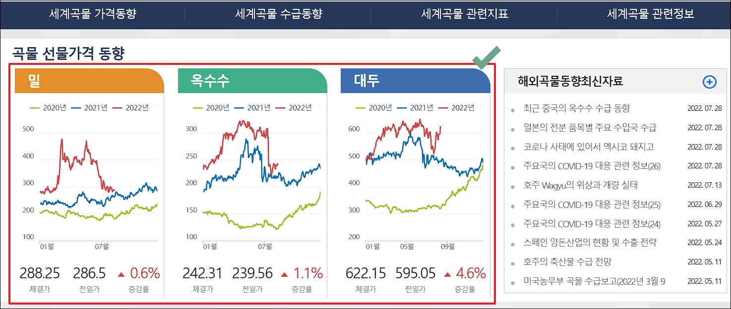 ▼곡물가격을 알아보기에 적합한 사이트 2곳을 알려드리려고 합니다. 국내 1곳과 해외 1곳인데요. 국내 사이트의 경우에는 다음과 같이 가격동향, 수급동향, 관련 지표와 정보가 보기 좋게 잘 정리되어 있습니다. 해외 사이트의 경우에는 거래되고 있는 곡물의 가격을 실시간으로 확인할 수 있다는 장점이 있습니다. 관련 자료도 풍부하죠.