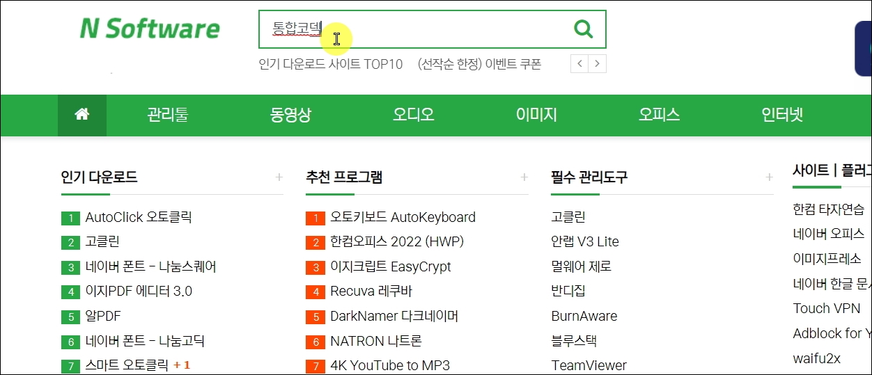 ▼N Software 홈페이지에 접속하면 여러 가지 프로그램에 대한 내용이 나타납니다. 요즘에 가장 인기 있는 것은 오토클릭, 고클린, 네이버 폰트, 이지PDF 에디터, 알PDF 등이 있네요. 대부분 무료로 다운로드 받아 사용할 수 있는 프로그램이오니 나중에 필요할 때 이용해 보세요. 그럼 통합코덱 다운로드를 위해 검색창에 "코덱"을 입력한 후 엔터키를 누릅니다.