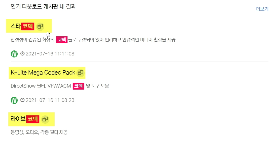 ▼"코덱"에 대한 검색 겨로가가 나타났습니다. 여러 가지 통합코덱이 나타나는데요. 여기에서 가장 첫 번째에 나온 스타코덱을 이용해 보겠습니다.
