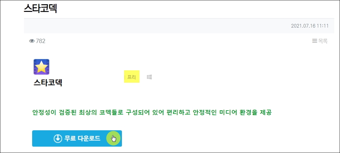▼안정성이 검증된 코덱들로 구성되어 있기 때문에 문제 없이 사용하기에 좋은 툴입니다. "프리" 표시가 되어 있는 것을 보면 무료 사용이 가능하다는 것을 알 수 있습니다. 하단에 위치한 [무료 다운로드] 버튼을 클릭해 주세요.