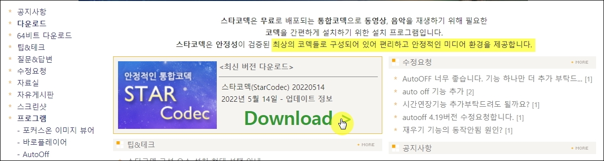 ▼새롭게 열린 페이지는 스타코덱에 대한 공식 홈페이지입니다. 이곳에서 최신버전의 통합코덱을 다운로드 받을 수 있는데요. 요즘에 많이 쓰이지 않는 소프트웨어임에도 불구하고 2022년 5월 14일까지 업데이트가 되었다는 것을 알 수 있습니다. 지금까지도 사용하기에 좋은 프로그램임을 의미하는 부분이라고 할 수 있죠.