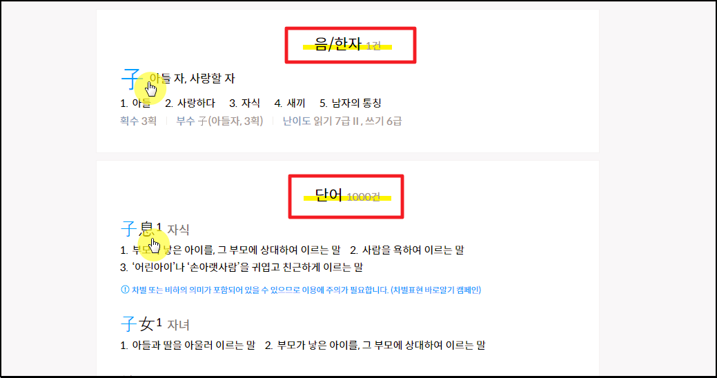 ▲ 제가 그려서 찾은 한문은 "아들 자" 입니다. 한자가 1건, 해당 한문을 포함한 단어가 1000건이나 검색이 되었는데요. 상세하게 알아보고 싶은 것을 선택해 주세요.