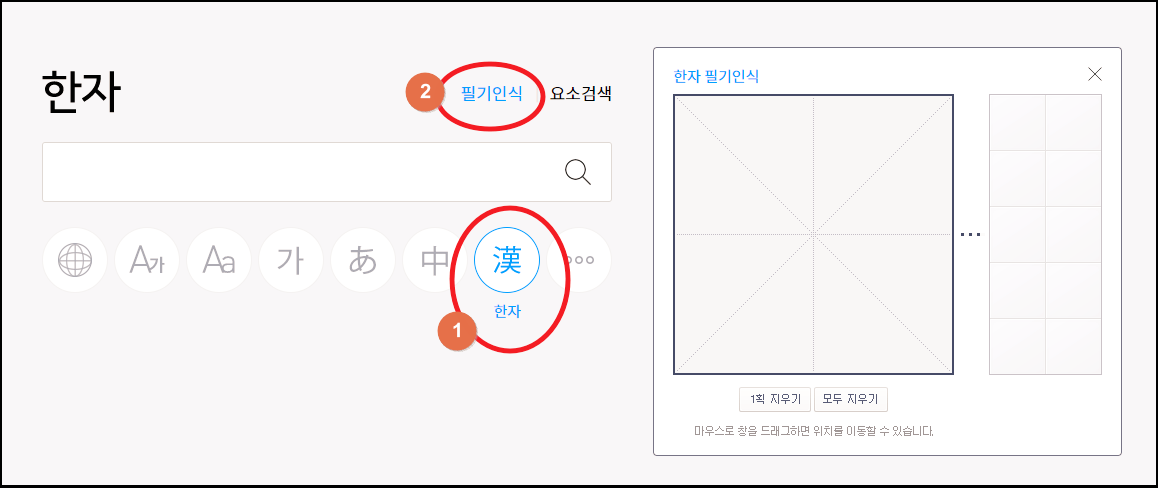 여기에서 [한자] 메뉴를 선택해 주세요. 그럼 검색창과 함께 [필기 인식] 기능을 실행할 수 있는 버튼이 나타납니다. 해당 기능을 클릭하면 "한자 필기인식" 창이 열리죠.