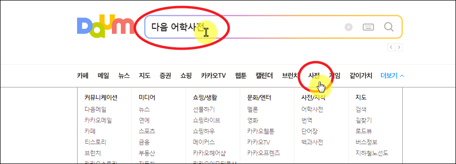 일단 다음 사이트의 메인화면에서 [사전] 메뉴를 선택해주세요. 또는 "다음 어학사전"을 검색하여 해당 사이트로 이동하면 됩니다.