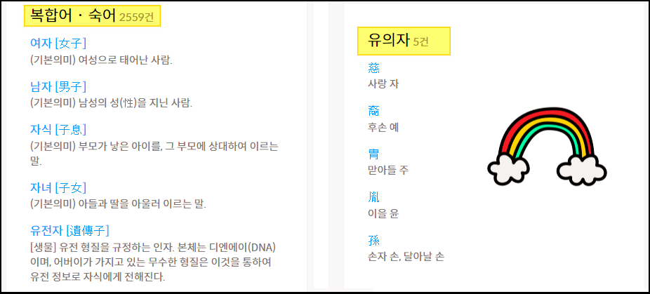 ▲ "아들 자"에 대한 상세한 사전 정보를 볼 수 있는 페이지가 열렸습니다. 옥편으로 한문찾기를 진행하는 것보다 훨씬 많은 양의 정보를 제공하고 있는데요.