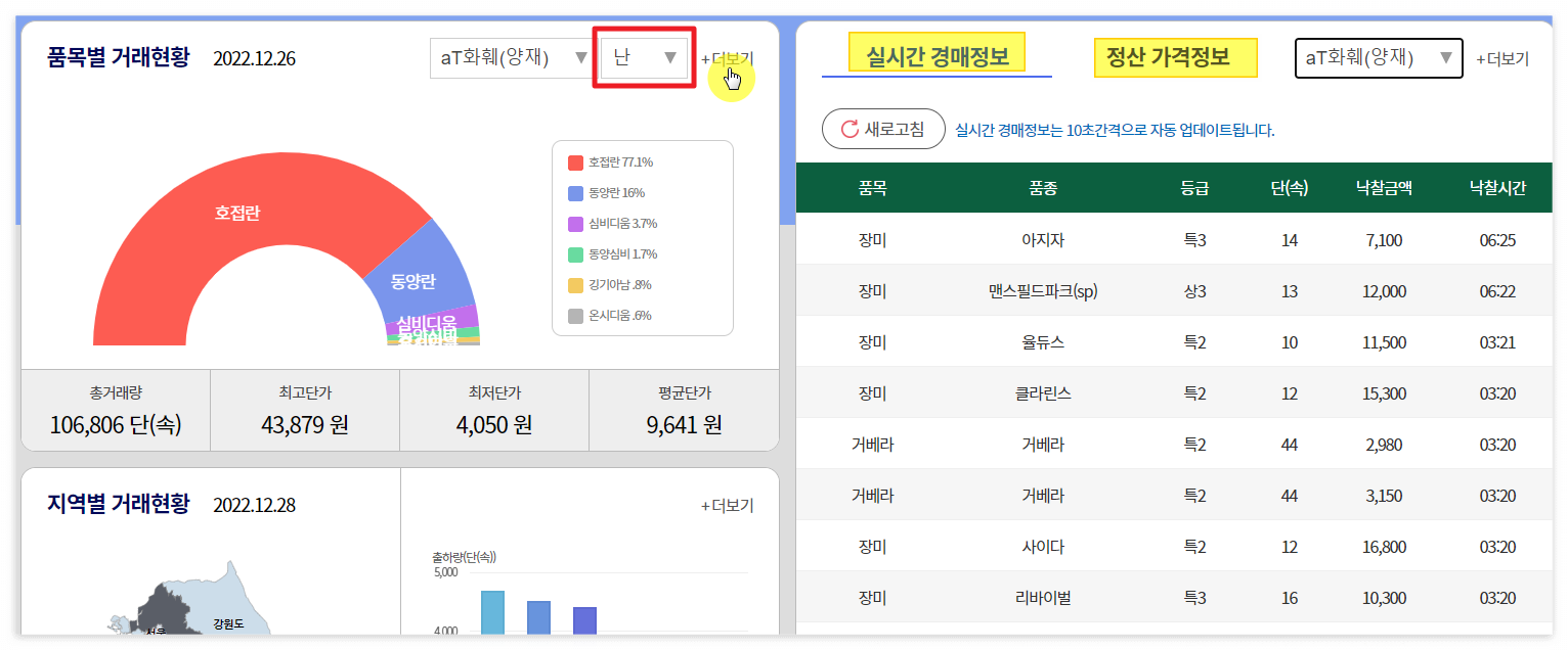 메뉴에서 "실시간 경매정보"를 선택해 보세요. 그럼 판매기관과 품목을 선택할 수 있는데요. 절화, 난, 관엽, 춘란 중에서 난이나 춘란을 선택하면 됩니다. 그 다음에 있는 날짜, 품목, 품종, 지역도 추가로 선택할 수 있어요.