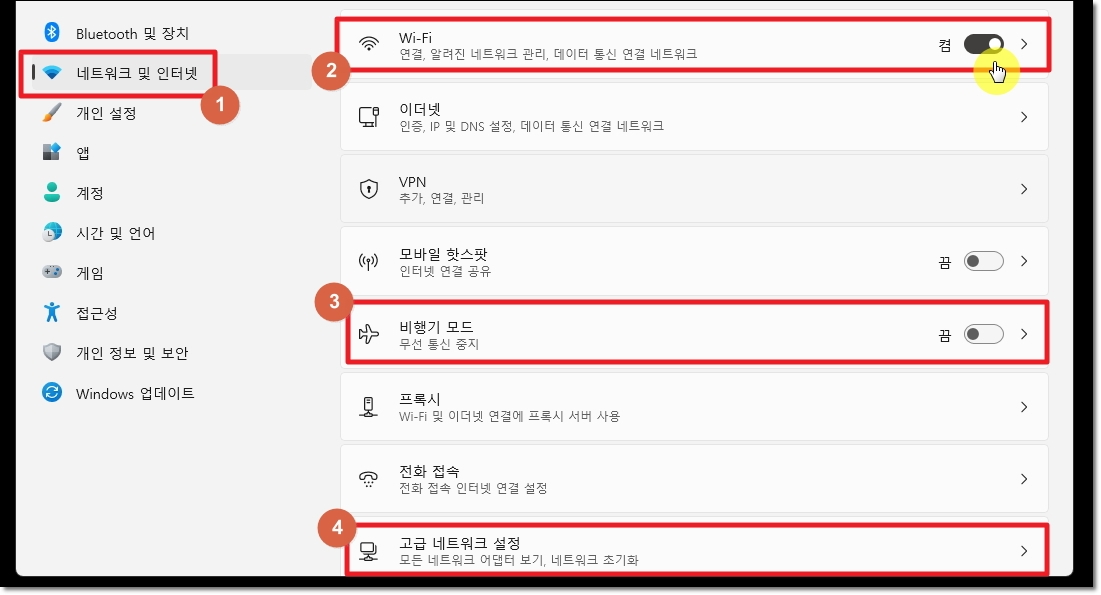 제어판을 통해 [네트워크 및 인터넷] 창을 열어도 되는데요. 해당 창에서 맨 위에 보면 와이파이 기능을 의미하는 [Wi-Fi]가 있습니다. "끔"으로 되어 있다면 체크 박스를 클릭하여 "켬"으로 변경해 주세요. 다음 화면에서 보면 "비행기 모드"가 보일 텐데요. 이 부분이 "켬"으로 되어 있다면 반대로 "끔"으로 해주시길 바랍니다. 여기까지 진행했음에도 iptime 공유기와 연결안됨 현상이 여전하다면 [고급 네트워크 설정]을 클릭해 주세요.
