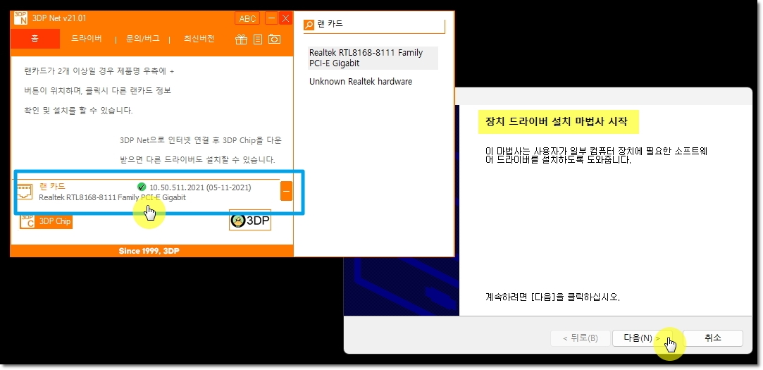 다운 받아 설치한 3dp net을 실행해 보세요. 그럼 내 PC에 장착되어 있는 랜카드에 대한 정보가 나타납니다. 해당 정보에서 장치 이름을 클릭해 보세요. 그럼 장치 드라이버 설치 마법사가 시작되면서 알맞는 드라이버를 설치해줍니다. 안내에 따라 [다음] 버튼만 누르면 쉽게 설치 완료를 할 수 있어요.