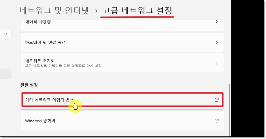 고급 네트워크 설정 페이지에서는 관련 설정 카테고리에 있는 [기타 네트워크 어댑터 옵션] 메뉴를 선택합니다. 그럼 새로운 설정창이 하나 열릴 거에요.