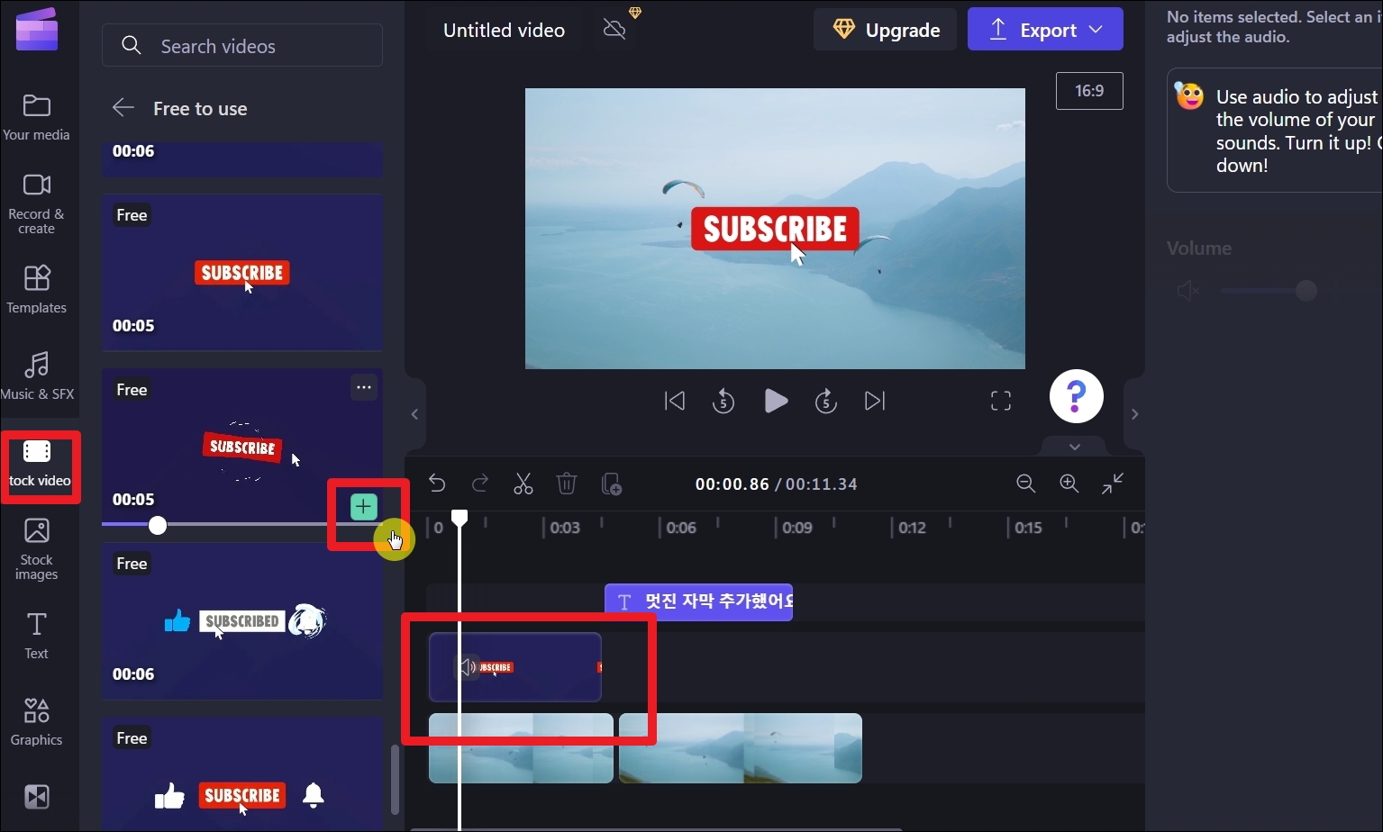 여러 가지를 추가할 수 있지만 이번에는 이미지 요소를 추가해 볼게요. "stock video"를 선택하면 되는데요.