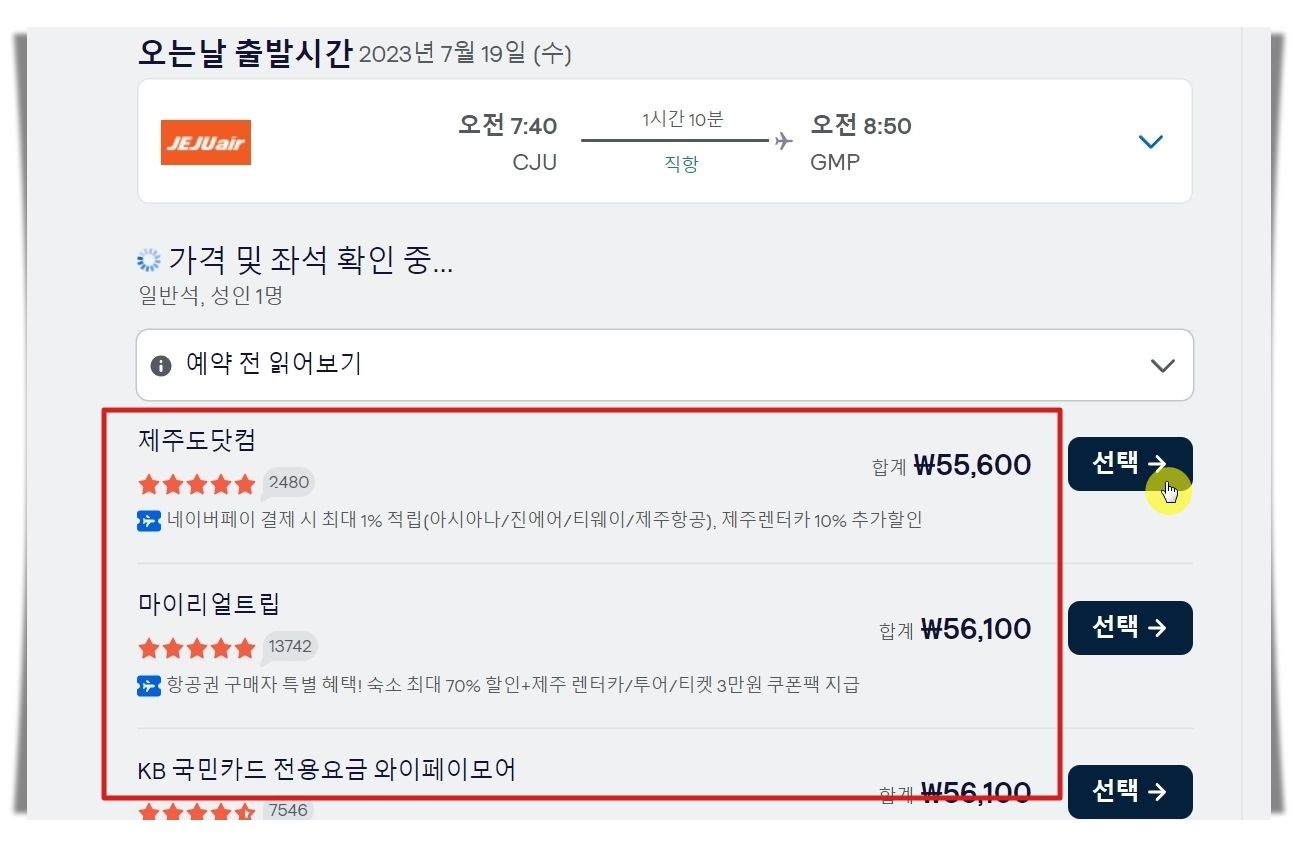 ▼ 티켓 예약을 진행할 업체를 선택해야 하는데요. 가격과 업체 평점이 표시되어 있기 때문에 선택하기 어렵지 않습니다. 특정 업체의 경우 일부 조건을 충족하는 사람에게 할인 혜택을 주기도 하는데요. 이러한 것을 잘 활용하면 제주도 항공권 최저가 금액에서 추가 할인을 받을 수 도 있습니다.