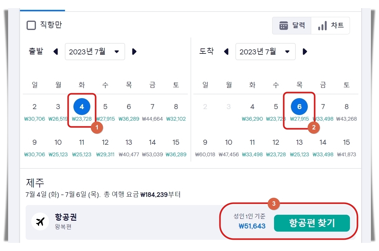 ▼ 2023년 7월을 선택한 결과 제주도를 다녀오는 항공편 중에서 4일에 출발하고, 6일에 돌아오는 것의 금액이 가장 저렴하네요. 날짜별로 최저가 금액이 표시가 되어 있으니 본인의 여행 일정을 감안하여 최적의 날짜를 선택해 보세요.