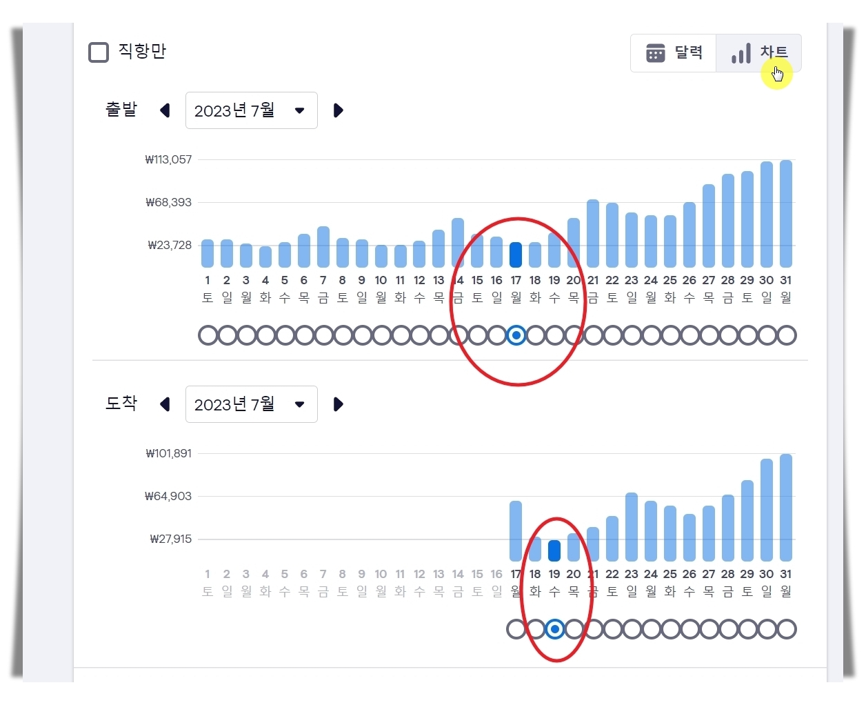▼ 달력 형태가 아닌 차트 형태로도 일별 가격 비교를 할 수 있는데요. 제주도 항공권 최저가 금액이 가장 낮은 날과 가장 높은 날 간에 차이가 최대 4배 정도 나는 듯 합니다. 그만큼 같은 항공권을 구하더라도 누구는 비싸게 구매하고, 누구는 싸게 사는 일이 생긴다는 것이죠.