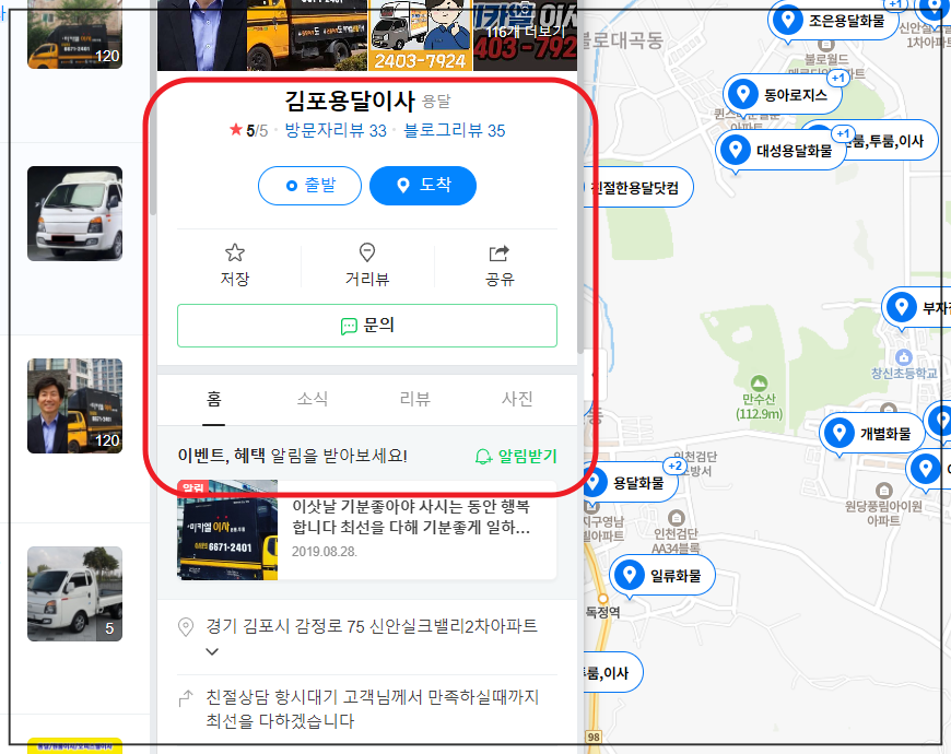 7. 업체명을 클릭하면 문의를 할 수 있도록 되어 있습니다. 연락처를 공개하는 곳도 있기 때문에 전화를 걸어 1통 용달 이사에 대한 견적을 구두로 받아보면 됩니다. 어차피 복잡한 내용이 아니기 때문에 견적 서류까지 주고 받을 필요는 없다고 생각합니다.