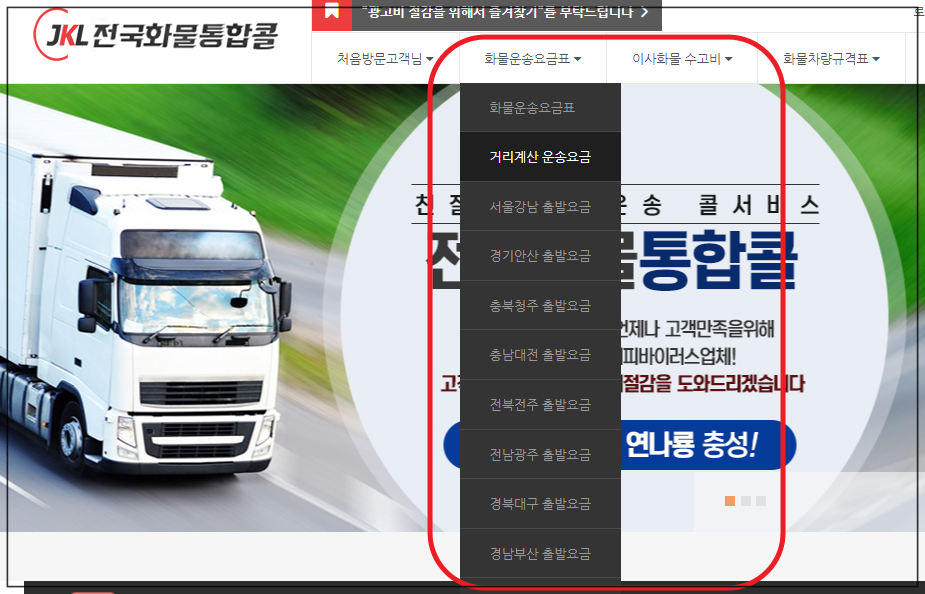 2. 사이트에 접속하면 메뉴에 화물운송 요금표, 이사화물 수고비 이렇게 2가지가 있습니다. 여기에서 화물운송요금표를 선택해 주세요. 참고로 서울강남, 경기안산, 충북청주, 충남대전 등 지역별로 운송 비용을 구분할 수 있기도 합니다.