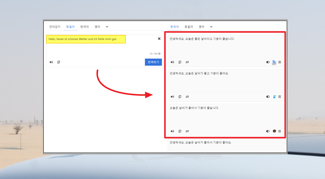 독일어 문장의 의미를 파악하는 데에는 물론이고, 한국어로 된 결과물을 얻고 싶을 때 서로 비교해서 가장 마음에 드는 것을 선택할 수 있죠.